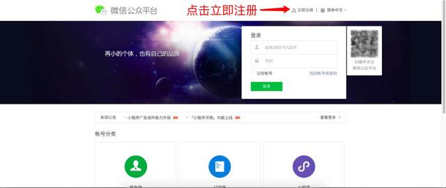 注冊操作路徑:打開微信公眾平臺,點擊右上角立即注冊